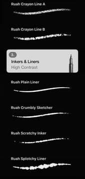 3. Inks & Liners (High Contrast): 6 brushes. From crisp to crunchy to delightfully imperfect. Includes Plain Liner, Crumbly Sketcher, Scratchy Inker, and Splotchy Liner, and more.